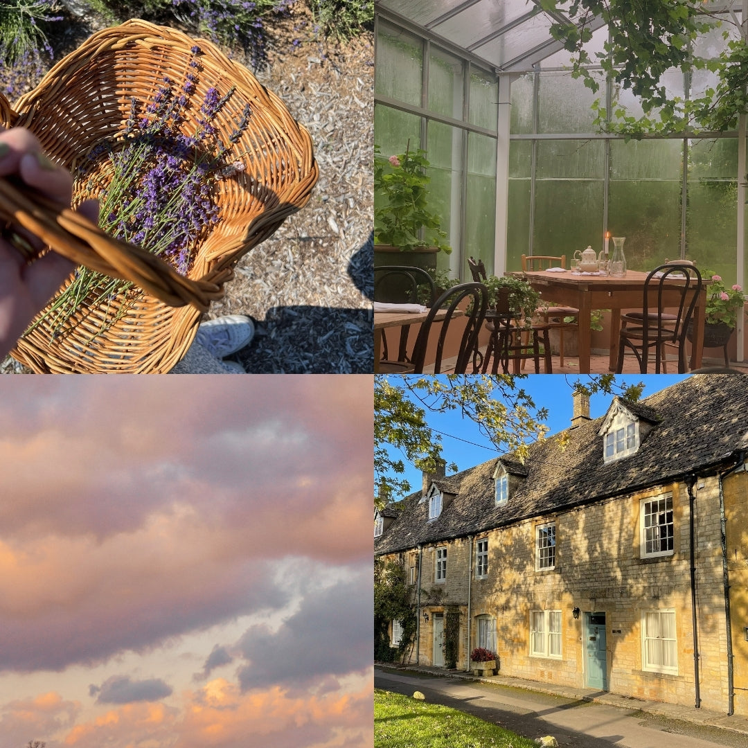 a country cottage, rolling hills and morning fog, hot tea with a splash of cream, the sound of rain, a passing cloud, dreams of tomorrow, hope on the horizon