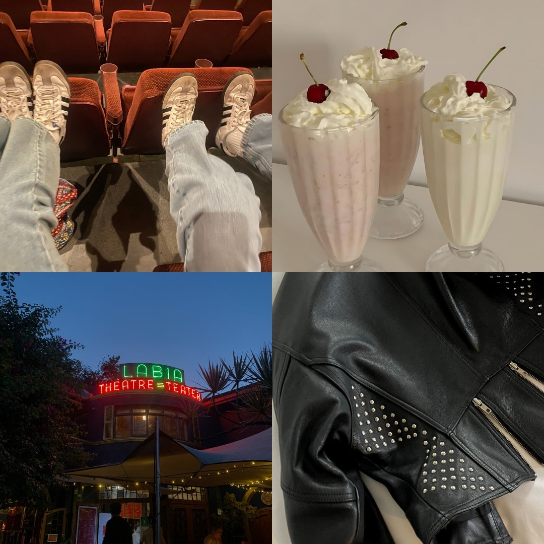 wearing her leather jacket, a drive-in movie, kissing in the backseat, cigarettes and chapstick, the cherry on a milkshake, chipped nail polish, silver rings in Silver Lake, messy hair, low slung jeans, talking ’til 3am